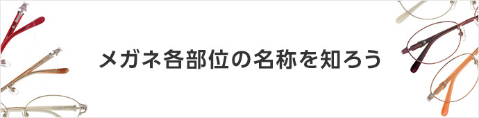 ここではメガネフレームについての知識をご紹介します。各部分の名称を知ることで、こだわりたいポイントに気づくこともできますし、お店でのメガネ選びにも役に立ちますよ。